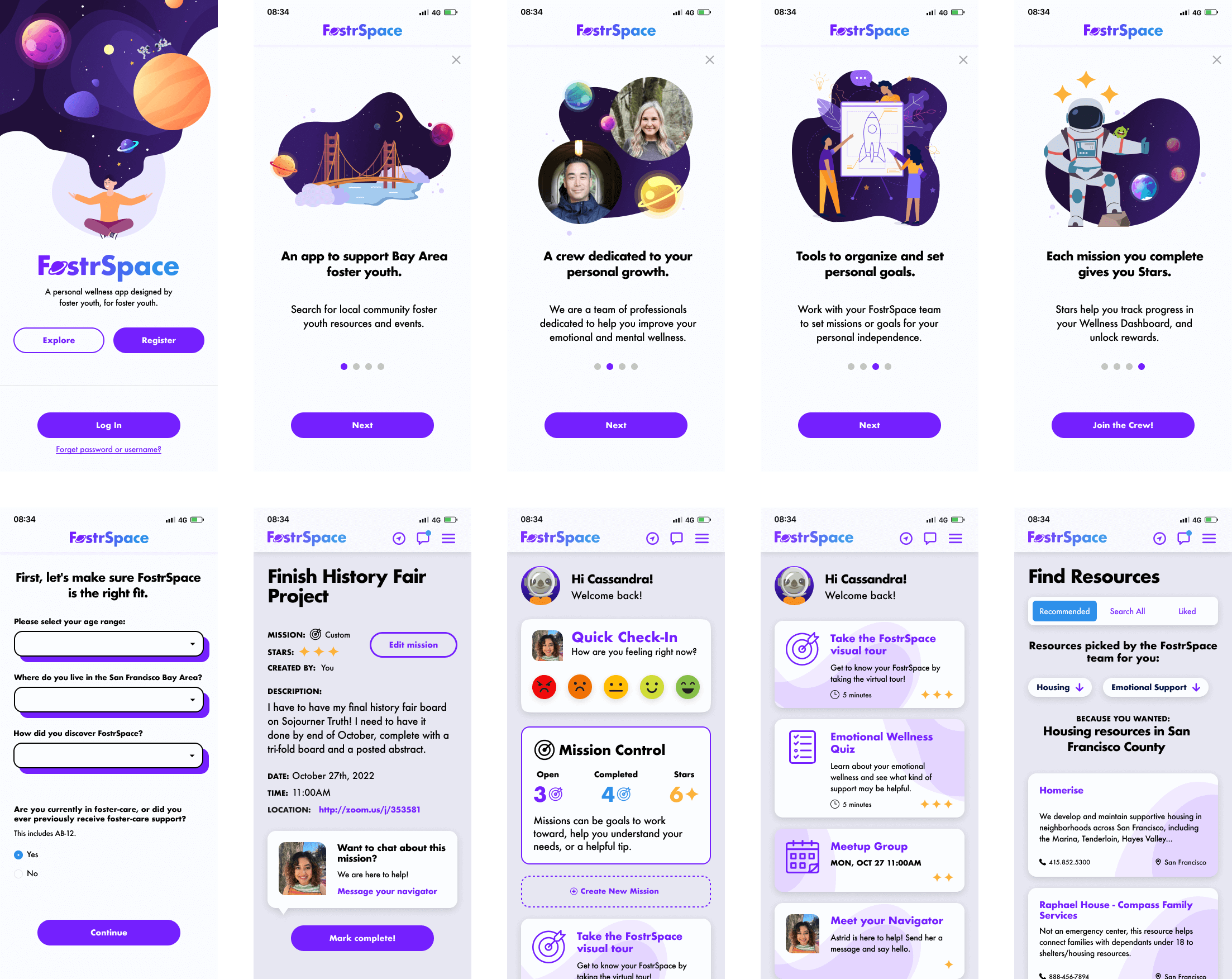 The FostrSpace brand is built around a space theme that represents exploration, discovery, and possibility. At the center is an astronaut guide who leads users through the interface, symbolizing support and companionship on their journey. This visual language reinforces the idea that young people are not alone as they navigate their path to care and connection.